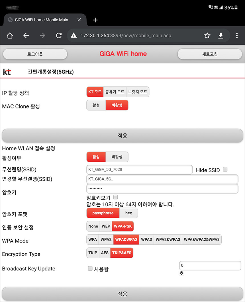 간편개통설정에서는 무선랜명(SSID)와 암호키를 자신이 조금 더 암기하기 쉬운 내용으로 변경할 수 있습니다. 그리고 내부 네트워크의 보안을 위해서 암호 자체는 패턴을 단순화하지 않는 것이 좋을 것 같습니다.