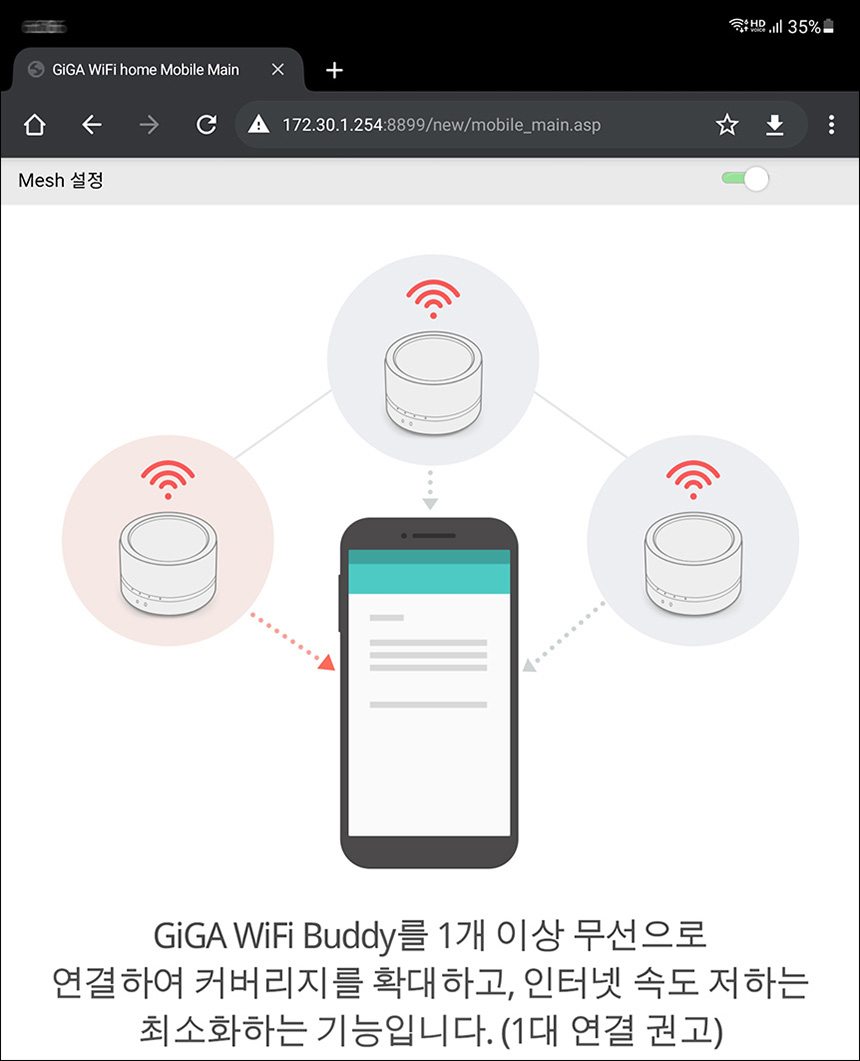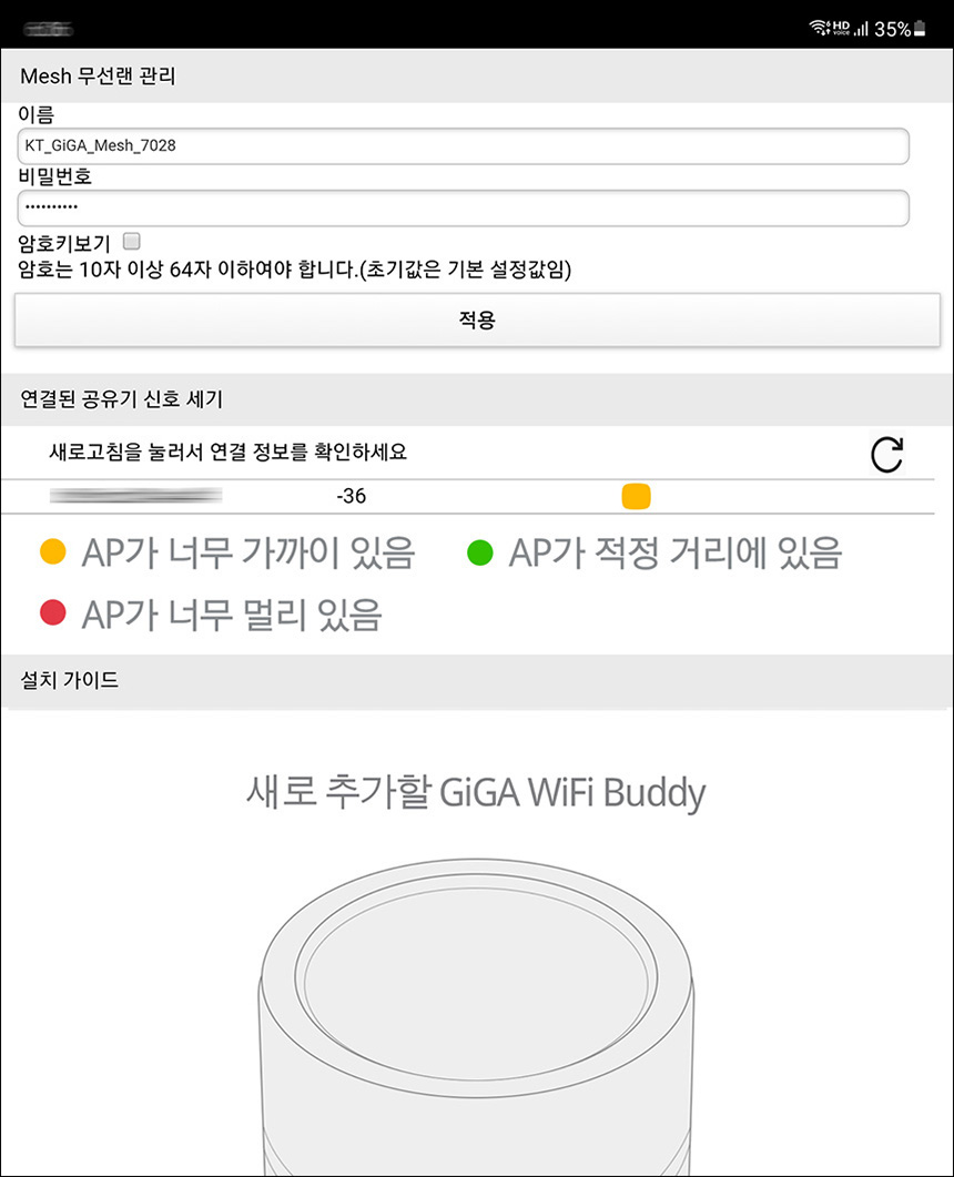 연결이 완료되면 GiGA WiFi Buddy ax 와이파이 증폭기는 KT_GiGA_Mesh_ 라는 네트워크 이름이 자동으로 설정되고 패스워드는 공유기와 동일하게 세팅됩니다. 그리고 잠시 후에 살펴볼 상세설정에서 이름과 암호를 변경할 수 있습니다.
