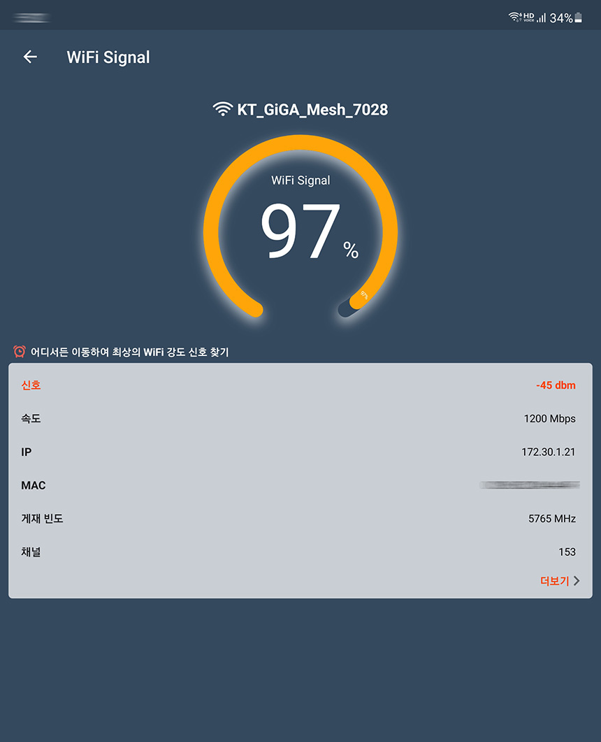 실제로 거실에서 KT GiGA WiFi home ax 공유기의 무선 인터넷 신호를 확인해 보면 상당히 강력하다는 것을 확인할 수 있습니다. 그래서 인터넷 사용에 문제가 없습니다.