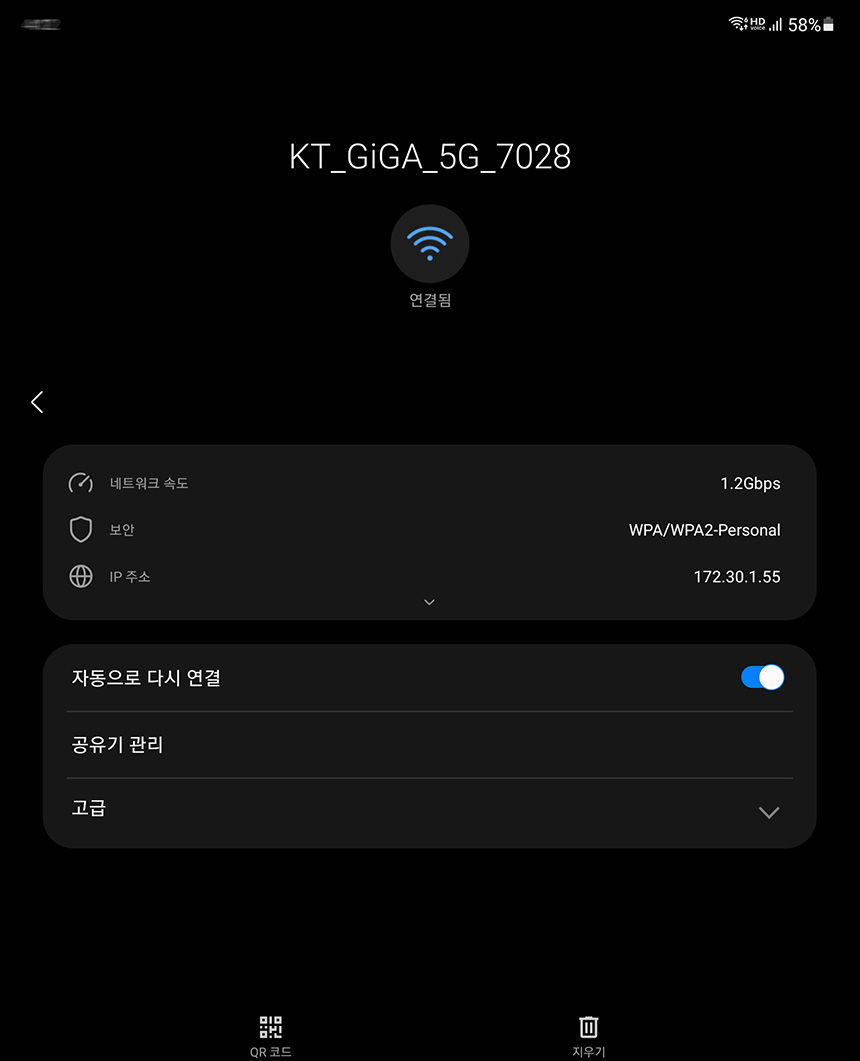 스마트폰을 이용해서 KT GiGA WiFi home ax 공유기에 접속해 보면 위쪽의 WiFi 표시 부분에 6이라는 문구가 추가되는 것을 확인할 수 있습니다. 그리고 네트워크 속도는 1.2Gbps로 연결됩니다.