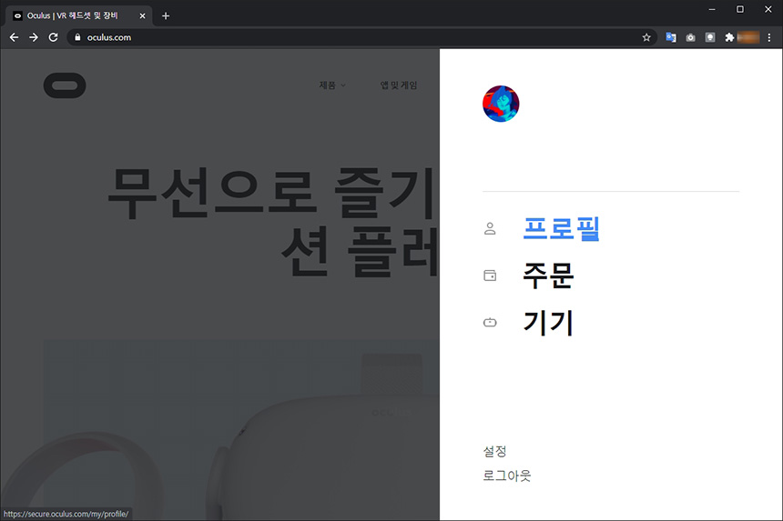 우선 오큘러스 홈페이지에 접속한 후에 오른쪽에 배치된 메뉴를 선택하면 프로필이라는 옵션이 준비된 것을 확인할 수 있습니다. 그리고 최근에 정식 발매가 되어서 빠르게 구매할 수 있게 되었지만 품절입니다.