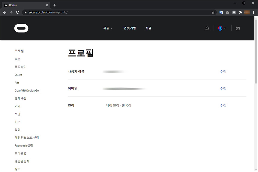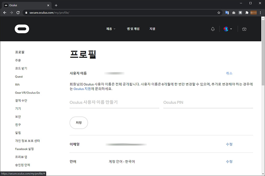 사용자 이름을 오큘러스 퀘스트2 자체나 앱에서 변경하려고 시도를 했으나 제대로 동작하지 않았습니다. 그래서 오큘러스 홈페이지에서 관련 정보를 확인할 수 있었습니다.