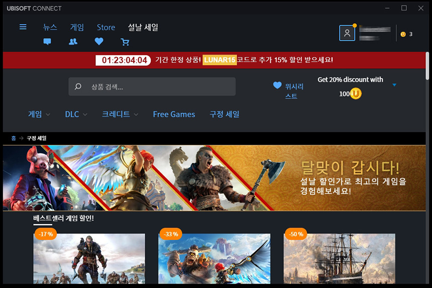 우선 유비소프트 커넥트를 설치하고 설날 세일 항목을 확인해 보면 15% 추가 할인을 받을 수 있는 LUNAR15라는 코드도 제공되는 것을 확인할 수 있습니다. 평소에 유비소프트의 게임을 좋아하는 분들에게는 메리트가 있을 것 같습니다.
