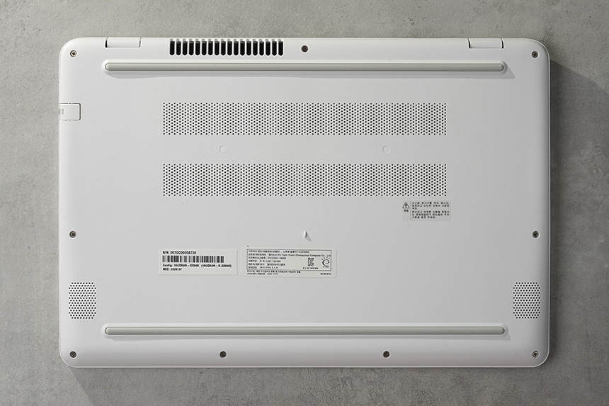 LG전자 15UD50N-GX30K 노트북의 하판에는 위 아래에 기다란 형태의 고무 지지대가 배치되어 있어서 책상 위에서 잘 미끄러지지 않는 편입니다. 그리고 디자인도 심플한 편입니다.