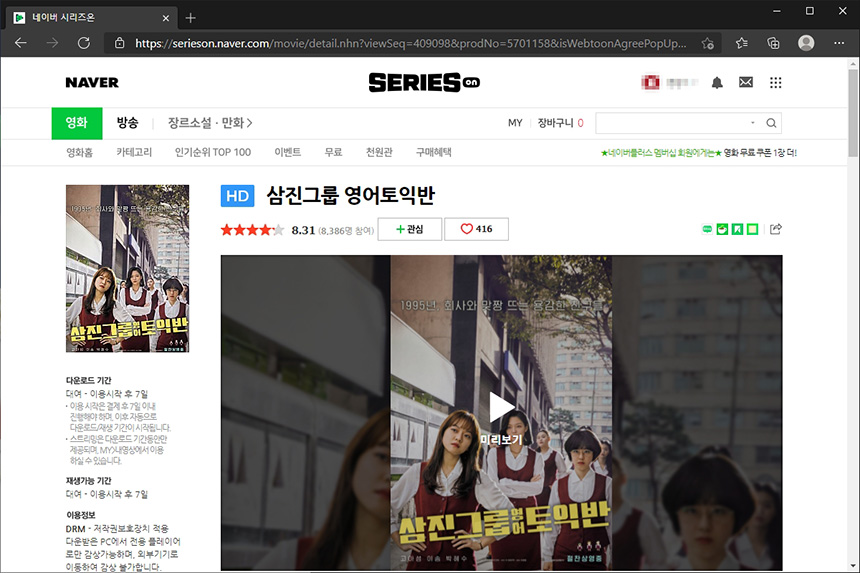 저는 삼진그룹 영어토익반을 선택한 다음엔 대여를 선택해서 구매를 할 수 있었습니다. 그런데 자세하게 살펴보면 구매와 대여 모두 쿠폰으로 구매할 수 있었습니다. 그래서 가능하면 구매해서 소장하는 것을 추천합니다. 이벤트 주의 사항을 확인해 보면 2만원 이하의 영화만 구매할 수 있다고 합니다.