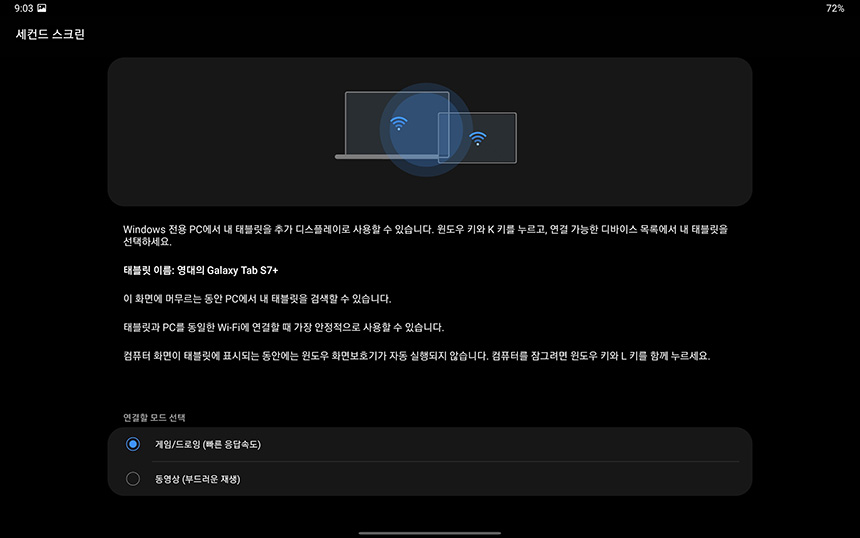 세컨드 스크린 기능을 실행시키면 컴퓨터에서 윈도우키 + K 로 동작시켜줄 수 있다는 내용이 설명되어 있습니다. 그리고 연결할 모드는 게임/드로잉(빠른 응답속도)와 동영상(부드러운 재생) 중에서 선택할 수 있습니다.