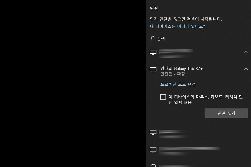 그리고 데스크톱이나 노트북에서 윈도우 + K를 누르면 갤럭시탭S7 플러스가 검색됩니다. 참고로 와이파이를 사용해서 연결되기 때문에 PC에 반드시 WI-Fi장치가 장착되어 있어야 합니다. 데스크톱은 AX200이나 AX201 어댑터를 연결해서 사용하는 것을 추천합니다.