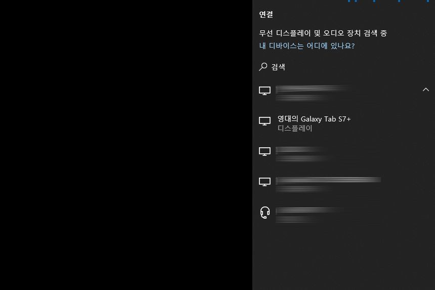 그리고 데스크톱이나 노트북에서 윈도우 + K를 누르면 갤럭시탭S7 플러스가 검색됩니다. 참고로 와이파이를 사용해서 연결되기 때문에 PC에 반드시 WI-Fi장치가 장착되어 있어야 합니다. 데스크톱은 AX200이나 AX201 어댑터를 연결해서 사용하는 것을 추천합니다.