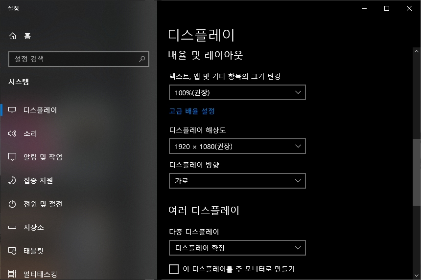 그리고 해상도를 살펴보면 FULL HD(1920 x 1080)으로 설정된 것을 확인할 수 있습니다. 갤럭시탭S7 플러스의 해상도는 훨씬 높은 편인데 1:1로 매칭되지 않는다는 점은 조금 아쉬운 부분입니다.