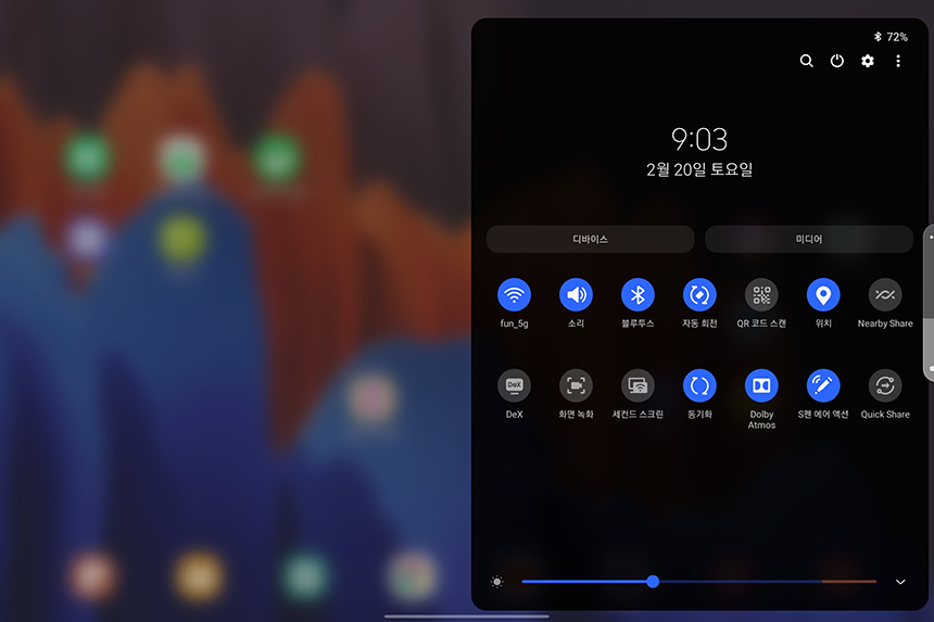 갤럭시탭S7 플러스의 세컨드 스크린 기능은 알림 화면에서 실행시킬 수 있습니다. 태블릿이나 컴퓨터에 별도의 앱이나 프로그램을 설치할 필요가 없다는 점이 편리한 부분이라고 생각되었습니다.