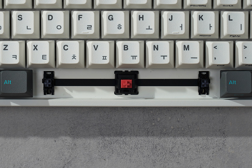 레오폴드는 스태빌이나 소음에 신경을 많이 쓰는 편입니다. 그래서 스페이스 바를 제거하고 내부를 확인해 보면 단단한 스펀지로 마무리되어 있는 것을 확인할 수 있습니다. 타이핑 소리는 동영상 리뷰에서 확인할 수 있습니다.