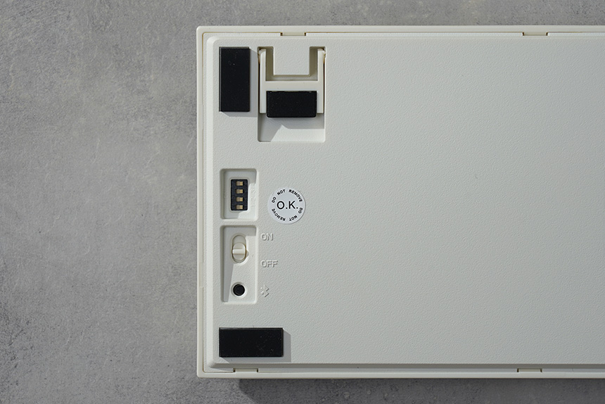 왼쪽에는 키보드 스위치의 일부 배열을 변경할 수 있는 DIP 스위치가 배치되어 있습니다. 그리고 아래쪽에는 블루투스 전원 스위치와 페어링 버튼이 배치되어 있습니다. 최신 블루투스 키보드들은 FN키와의 조합으로 페어링과 디바이스 전환을 할 수 있는데요. 조금 불편한 부분이라고 할 수 있습니다.