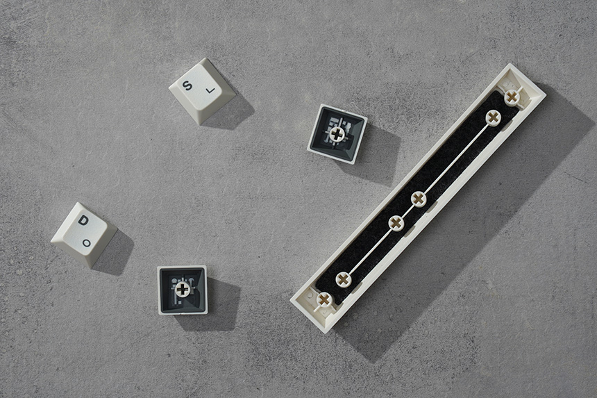 레오폴드 FC660MBT 키보드의 키캡은 1.5mm PBT 이중사출로 제작되었습니다. 예전부터 레오폴드의 키캡은 최고 수준이라는 평가를 받고 있습니다. 그리고 스페이스 바에 흡음재가 채워져 있다는 점도 재미있는 부분입니다.
