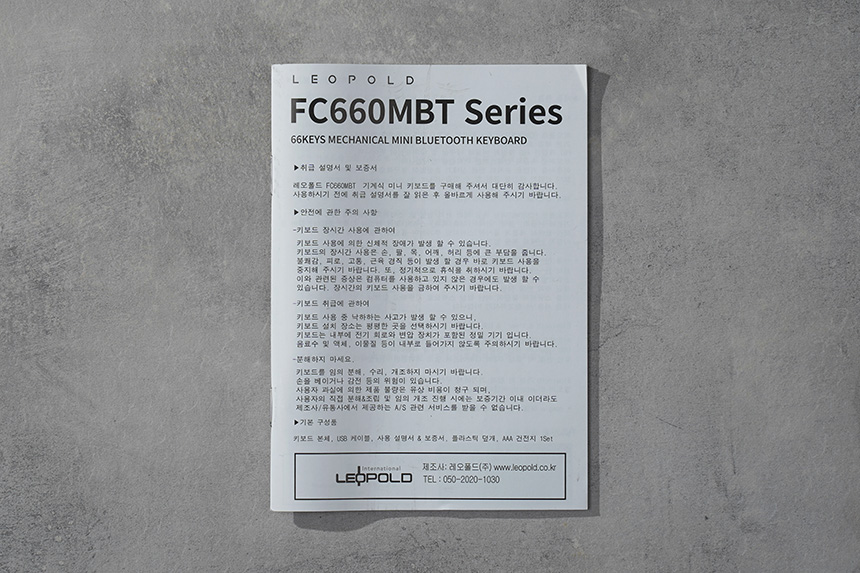 레오폴드 FC660MBT 키보드의 구성품을 살펴보면 취급 설명서가 한 장 포함되어 있습니다. 블루투스 페어링 방법 등이 설명되어 있으니 한 번 정도는 자세하게 읽어 보는 것이 좋을 것 같습니다.