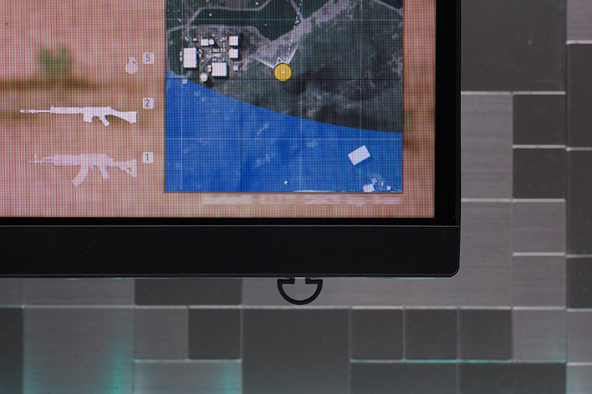 화면 아래쪽에는 패키지에 동봉된 마우스 홀더를 장착할 수 있는 홈이 준비되어 있습니다. 그래서 유선 마우스를 사용하는 분들은 마우스 번지처럼 활용할 수 있습니다. 게이머의 편의성을 세심하게 고려한 부분이라고 할 수 있습니다.
