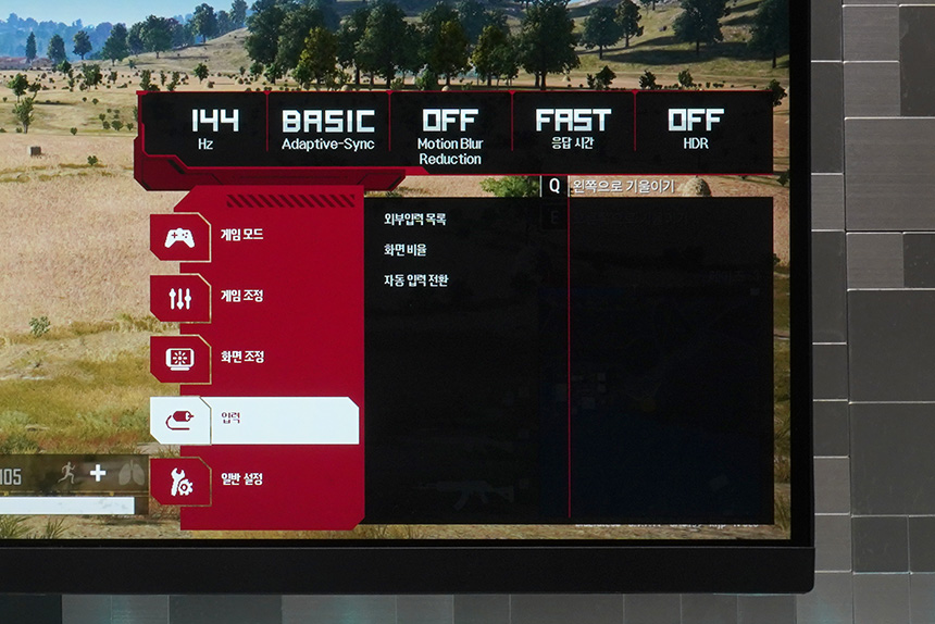 입력에서는 DP나 HDMI로 입력되는 목록을 확인하거나 화면 비율을 조절하고 자동 입력 전환 기능을 설정할 수 있습니다. 초기에 한 번 세팅하면 나중에 다시 확인할 일이 적은 기능 중의 하나입니다.