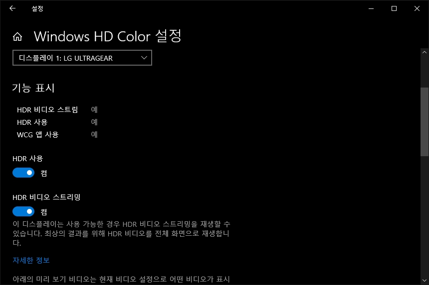 LG 울트라기어 27GN650에는 사실적인 색감을 표현해주는 HDR 10 기술이 탑재되었습니다. 윈도우10 기준으로 설정에서 Windows HD Color 설정을 켜주어야 합니다.