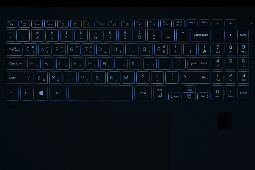 3열 숫자 전용키를 포함한 풀 사이즈 97키를 이용해서 각종 문서 작업을 하는 용도로도 LG 그램 16 노트북을 활용할 수 있습니다. 특히 백라이트가 탑재되어 있어서 야간에도 작업을 할 수 있습니다.
