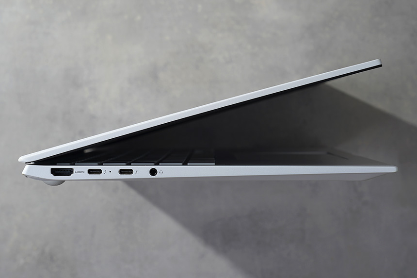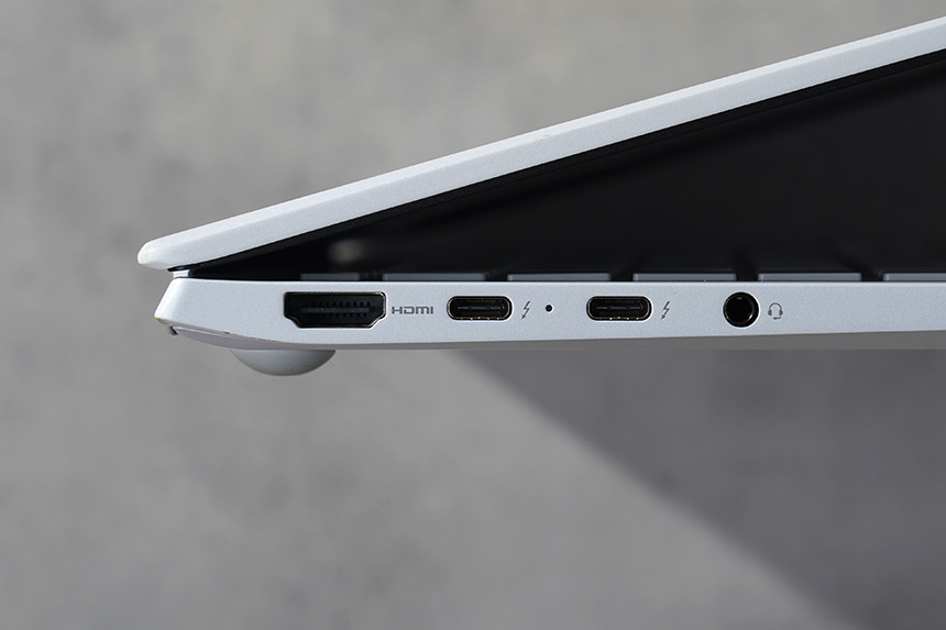 LG 그램 16 노트북의 입출력 단자를 확인해 보면 왼쪽에는 풀사이즈의 HDMI 단자와 썬더볼트4를 지원하는 두 개의 USB C타입 포트 그리고 헤드폰 출력 단자가 배치되어 있습니다. 특히 USB PD 충전을 지원해서 단 하나의 포트로 충전과 데이터 전송이 동시에 가능합니다.