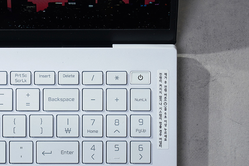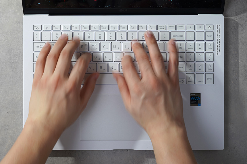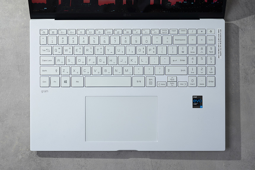 LG 그램 16 노트북의 키보드는 풀사이즈 97키가 적용되었습니다. 특히 3열 숫자 전용키가 포함되어 있어서 문서 작업이 많은 대학생이나 직장인들에게 유용할 것으로 예상합니다.