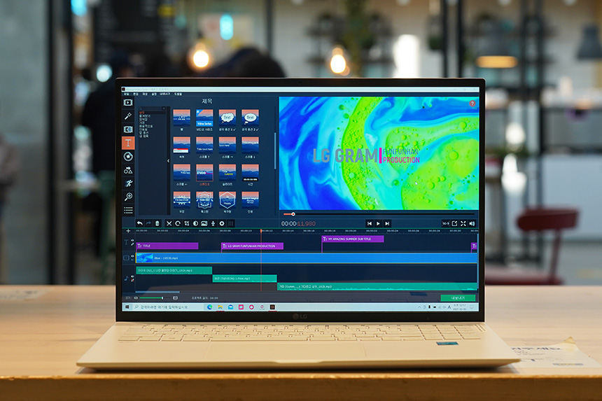LG 그램 16 노트북에 탑재된 11세대 인텔 i7-1165G7 프로세서는 동영상을 간단하게 컷 편집을 하고 자막을 다는 등의 용도로도 크게 부족하지 않은 성능을 제공합니다.