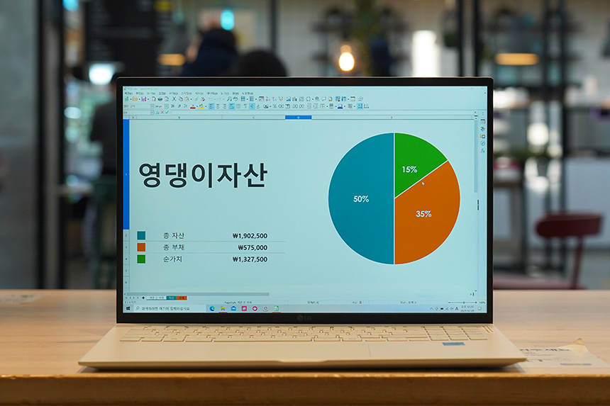 LG 그램 16 노트북에는 16:10 비율의 WQXGA(2560x1600) 해상도의 디스플레이가 탑재되었습니다. 일반적으로 노트북에 많이 사용되는 FULL HD(1920x1080) 해상도와 비교해서 한 화면에 더욱 많은 정보를 표현할 수 있습니다. 다양한 자료를 확인해야 하는 분들에게 유용한 부분입니다.