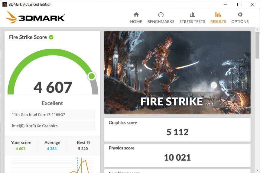인텔 아이리스 Xe 내장 그래픽카드의 3DMARK Fire Strike(파스) 점수를 확인해 보면 4607점(그래픽 스코어 5112점)이 측정되었습니다. 이전 세대 제품 대비 큰 폭의 성능 향상이 있는 것을 확인할 수 있습니다.