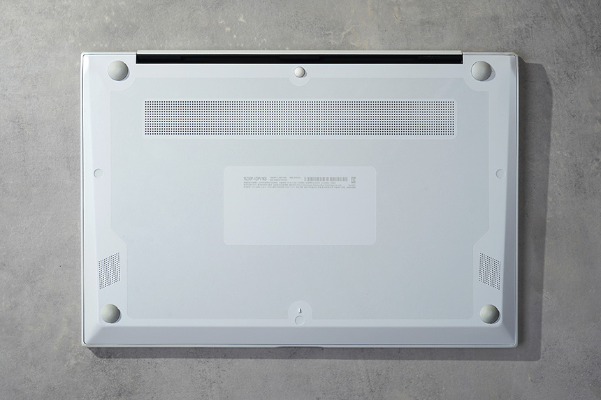 바닥을 살펴보면 모서리 부분에 고무 지지대가 배치되어 있어서 책상에서 잘 미끄러지지 않는 편입니다. 그리고 위쪽에 발열 해소를 위해서 통풍구가 준비되어 있습니다.