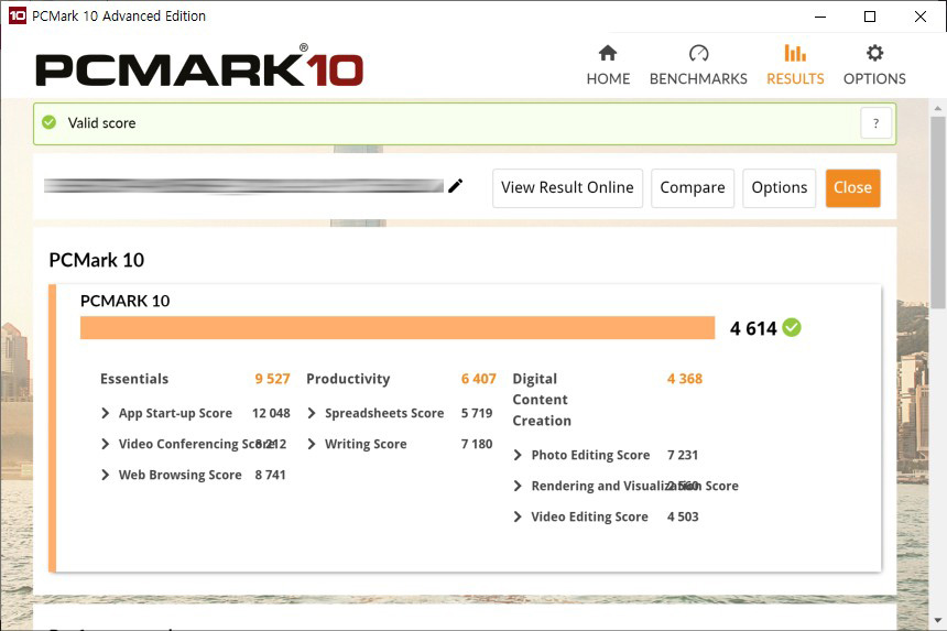 노트북의 전체적인 성능을 평가해주는 PCMARK10의 점수는 4614점이 측정되었습니다. 일부 게이밍 노트북을 제외하고는 최고 수준의 성능을 제공하는 제품이라고 평가할 수 있습니다.