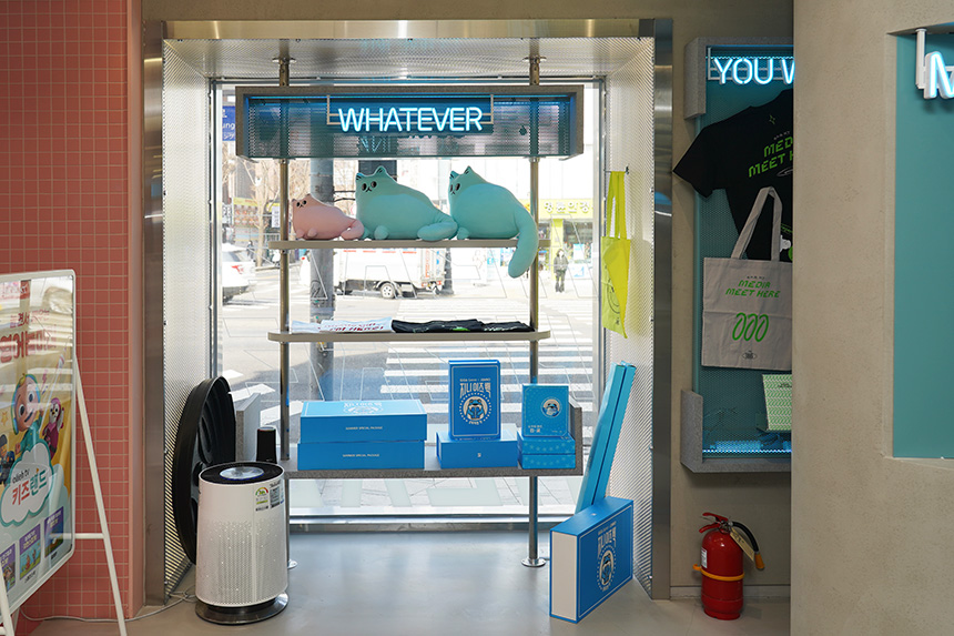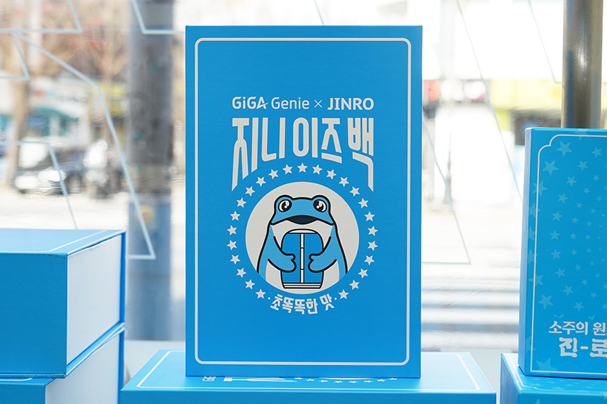 매장 내부를 간단하게 살펴보면 입구 쪽에는 KT와 진로의 콜라보레이션 제품인 지니 이즈 백이 준비되어 있습니다. 저의 이전 포스팅에서도 살펴볼 수 있는데요. 기가지니를 이쁘게 꾸밀 수 있는 커버나 무릎담요 등으로 구성된 패키지이고 퀄리티가 상당히 좋은 편입니다.