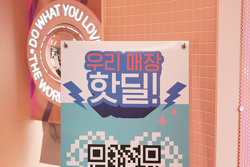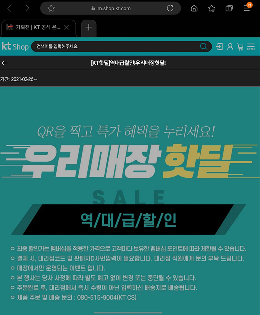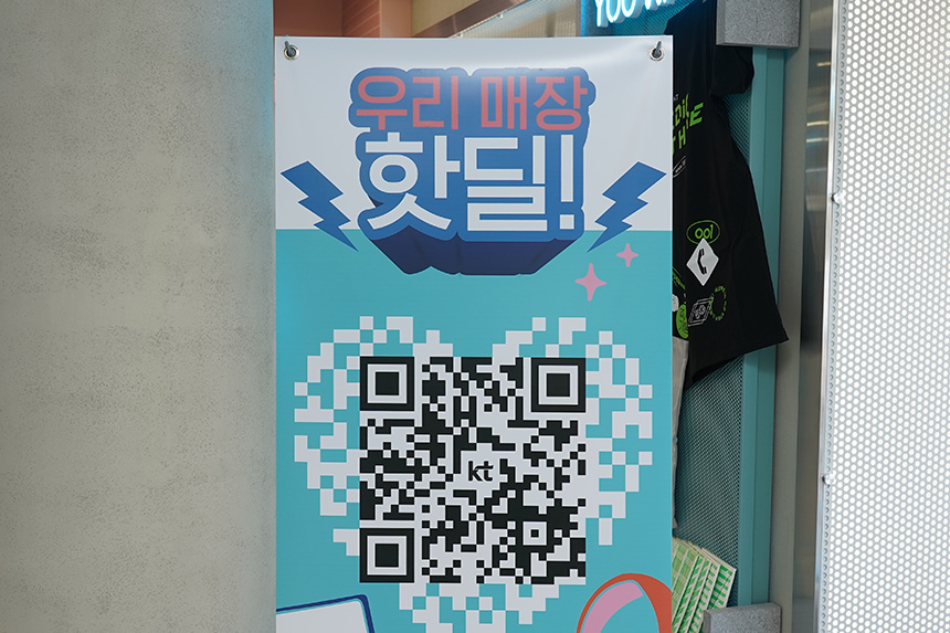 우리 매장 핫딜 서비스를 자세하게 살펴보면 우선 KT 매장 내부에 QR 코드가 인쇄된 입간판이 준비된 것을 확인할 수 있습니다. 그리고 스마트폰으로 스캔을 하면 관련된 내용이 안내됩니다.