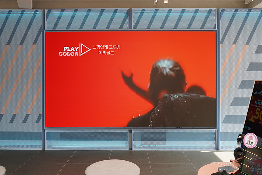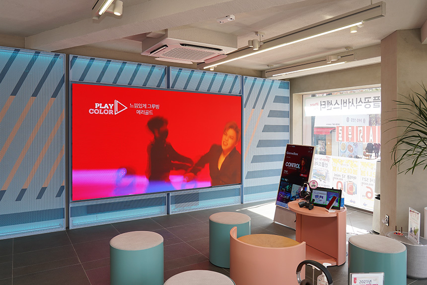 KT M&S 성대미디어점에는 각종 서비스를 받기 전 대기하는 장소가 준비되어 있는데요, 대형 스크린을 통해서 지루함을 달랠 수 있도록 디자인되어 있다는 점이 재미있는 부분입니다.