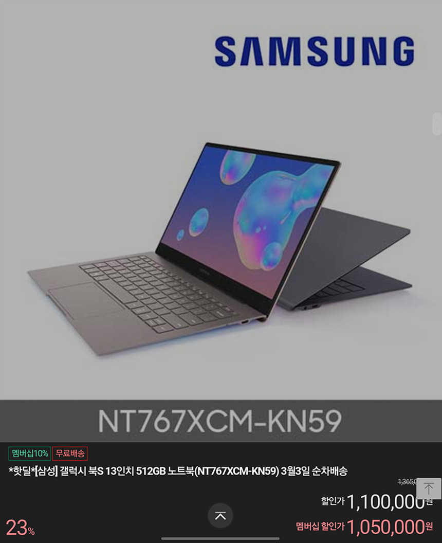 인텔 i5-L16G7 프로세서가 탑재된 갤럭시북S는 1,050,000원에 판매되고 있습니다. 콤팩트한 크기의 LTE 노트북으로 언제 어디에서나 인터넷에 접속해서 과제나 업무를 처리하는 분들에게 유용한 제품입니다.