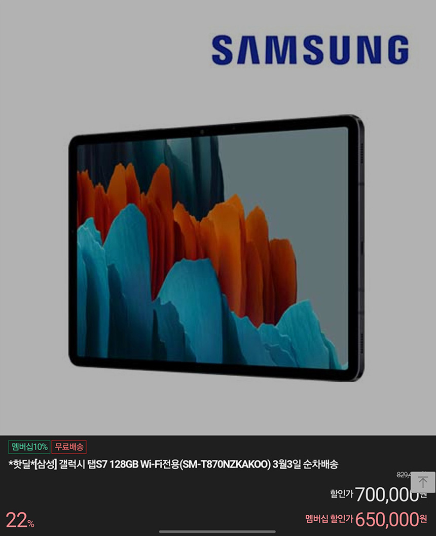 역시 삼성전자의 최신 태블릿 갤럭시 탭S7 Wi-Fi 모델도 650,000원에 구매할 수 있습니다. 플래그십 안드로이드 태블릿을 찾는 분들에게는 대안이 없다는 평가를 받는 제품입니다.