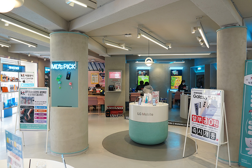 우리 매장 핫딜은 전국 KT 매장에서 진행되고 있습니다. 그중에서 저는 대학로에 있는 KT M&S 성대미디어점을 방문했습니다. 체험형 플래그십 매장으로 디자인되어서 다양한 제품들을 실제로 만져볼 수 있다는 점이 인상적이었습니다.