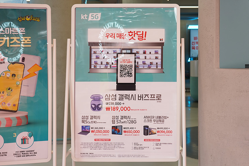 매장 입구에는 우리 매장 핫딜에 관련된 입간판이 준비되어 있습니다. 주목할 만한 부분은 삼성 갤럭시 버즈 프로나 갤럭시북S 그리고 갤럭시탭S7과 같은 최신 IT 제품들을 싸게 살 수 있다는 점입니다.