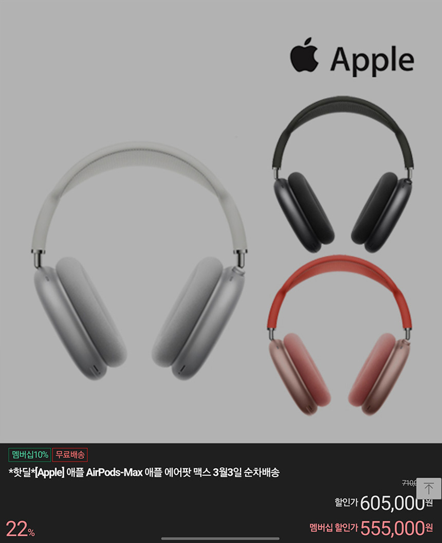 애플의 에어팟 맥스는 555,000원에 판매되고 있습니다. 애플의 최신 노이즈 캔슬링 헤드폰으로 애플의 제품으로 생태계를 구축한 분들에게는 메리트가 있는 제품이라고 할 수 있습니다.