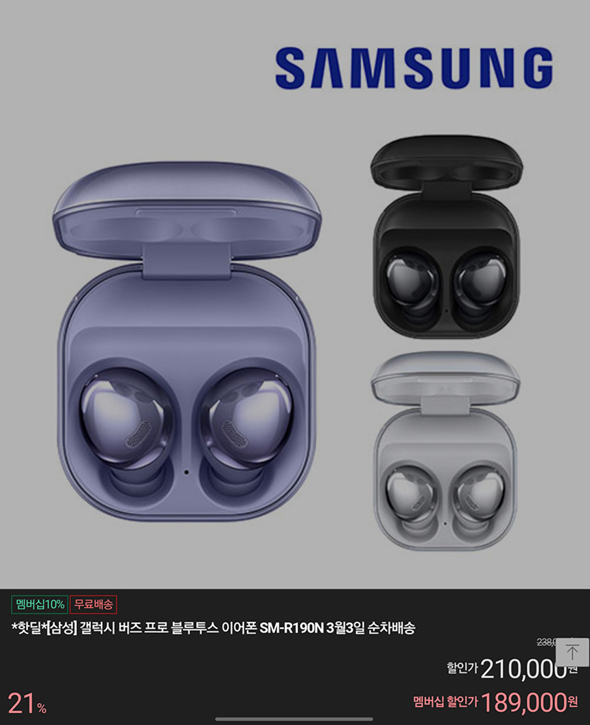 우선 삼성전자의 최신 노이즈 캔슬링 블루투스 이어폰인 갤럭시 버즈 프로는 189,000원에 구매를 할 수 있습니다. 저도 사용하고 있는데요. 노캔 성능이나 음질은 최고 수준이라고 할 수 있습니다.