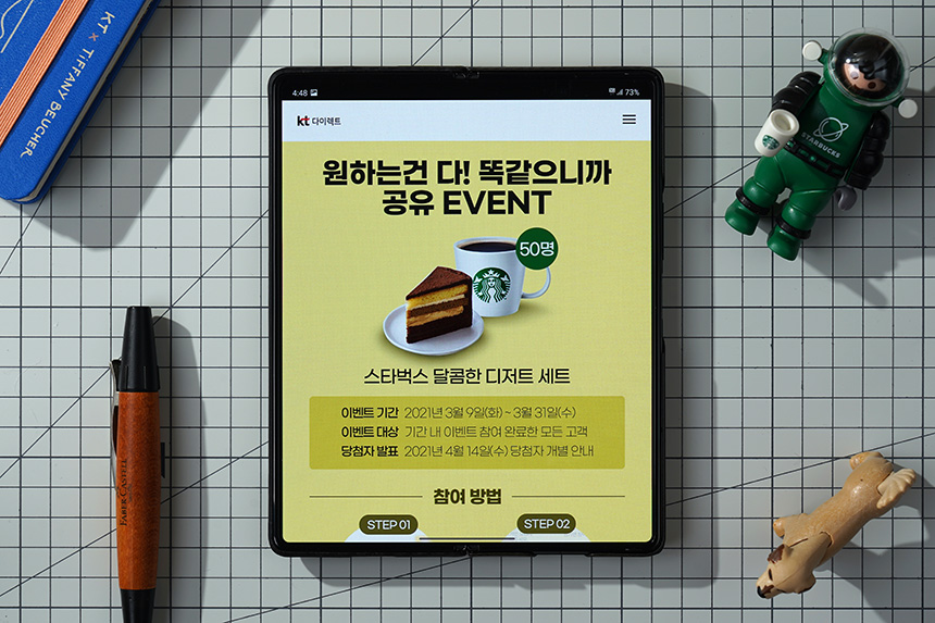공유 이벤트로 진행하고 있습니다. KT Y 무약정 플랜 요금제 출시 소식을 필수 해시태그를 포함해서 업로드하고 응목하기를 누르면 모든 고객에게 스타벅스 탈콤한 디저트 세트가 제공됩니다.