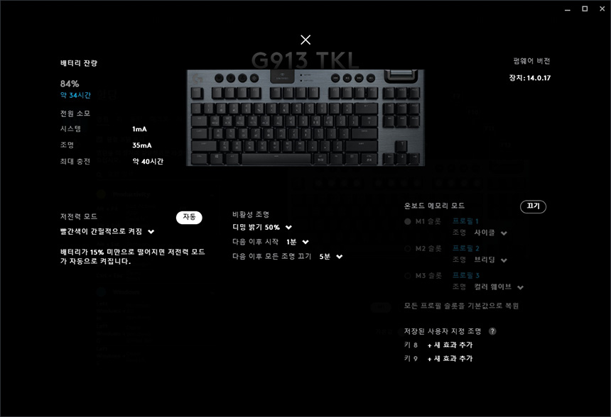 로지텍 G HUB의 설정을 살펴보면 현재 배터리 잔량과 저전력 모드 그리고 비활성 조명과 온보드 메모리 모드 등 다양한 기능들을 조절해 줄 수 있습니다. 최고 수준의 제품이라서 설정도 상당히 디테일하다는 특징이 있습니다.