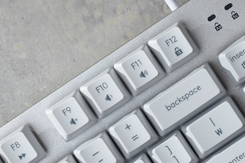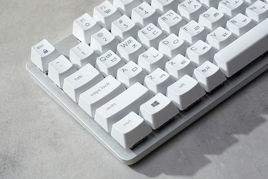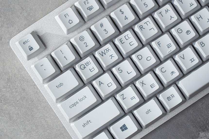 키캡은 실크 인쇄로 마무리되었고 한글과 영문 각인 모두 큼지막하고 깔끔한 느낌을 주는 편입니다. 그리고 편안한 타이핑을 위해서 키캡의 중앙은 오목하게 설계되었습니다.