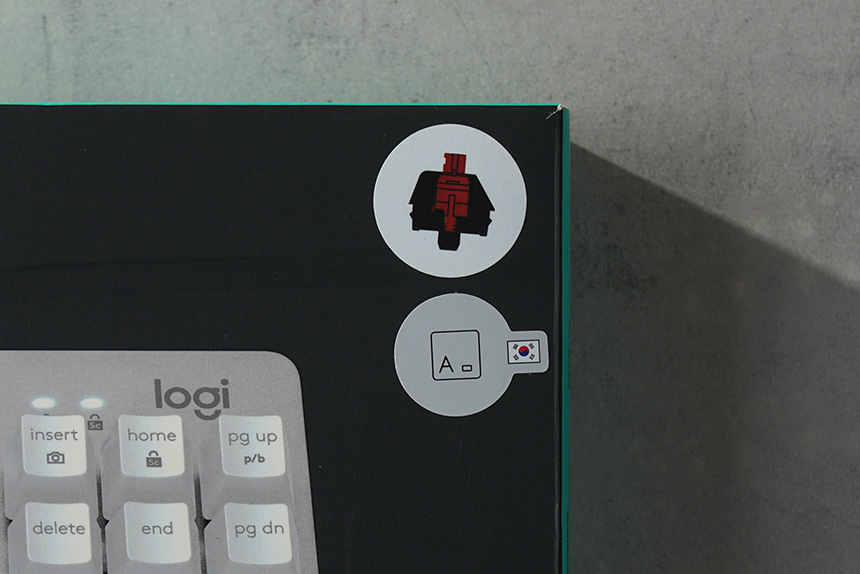 상단의 오른쪽 위에는 TTC 적축 기계식 스위치가 탑재되었고 한국어 레이아웃이 적용되었다는 것을 알려주는 스티커가 부착되어 있습니다. 적축 스위치는 청축 스위치와 비교해서 상대적으로 소음이 적은 편이라는 장점이 있습니다.