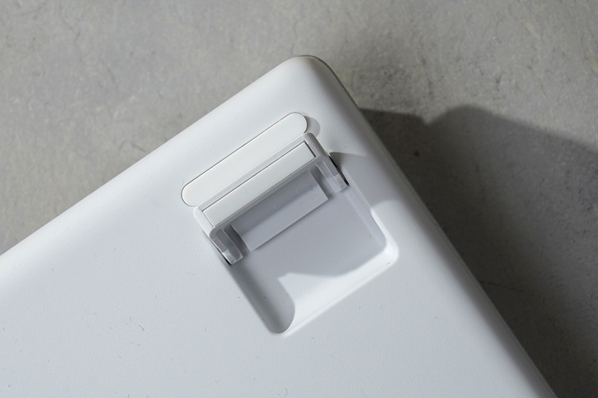 상단의 좌우에는 키보드 받침대가 배치되어 있습니다. 그래서 자신의 필요에 따라서 각도를 4도와 8도 중에서 선택할 수 있습니다. 그리고 받침대에 고무 지지대가 배치되어 있어서 안정적으로 타이핑을 할 수 있습니다.