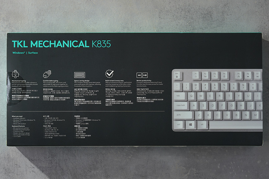 박스의 뒷면에는 로지텍 K835 TKL 키보드의 주요 특징이 설명되어 있습니다. 참고로 색상은 오프화이트와 그래파이트로 출시되었고 자신의 데스크테리어에 따라서 컬러를 선택할 수 있습니다.