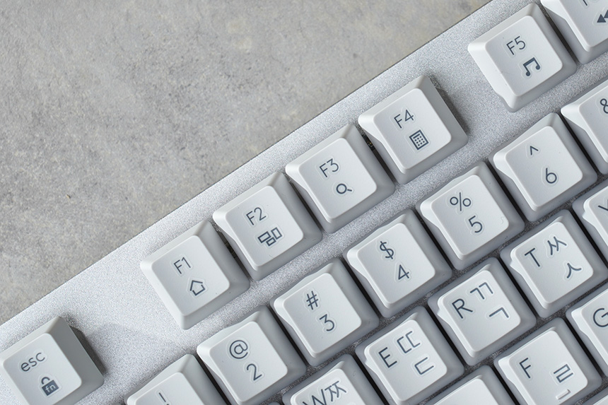 키캡은 실크 인쇄로 마무리되었고 한글과 영문 각인 모두 큼지막하고 깔끔한 느낌을 주는 편입니다. 그리고 편안한 타이핑을 위해서 키캡의 중앙은 오목하게 설계되었습니다.