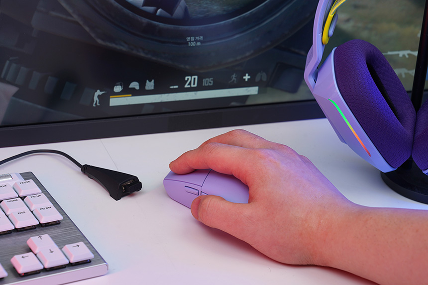 로지텍 G304 라일락의 무게는 약 97.9g으로 측정되었습니다. 배터리를 내장하고 있는 무선 마우스임에도 불구하고 상당히 가벼운 편이어서 휴대성이 좋은 것은 물론이고 움직임이 많은 게임을 플레이할 때 피로를 덜 느낄 수 있습니다.