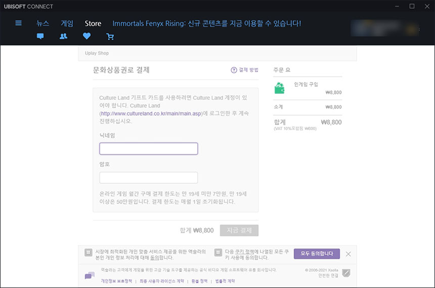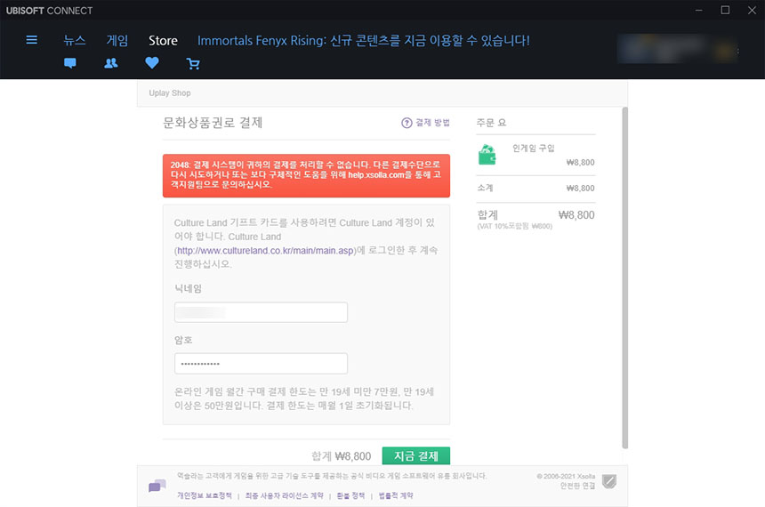 컬쳐랜드 문화상품권을 선택하면 컬쳐랜드 홈페이지의 닉네임과 암호를 입력해주어야 합니다. 그런데 “2048: 결제 시스템이 귀하의 결제를 처리할 수 없습니다. 다른 결제수단으로 다시 시도하거나 또는 보다 구체적인 도움을 위해 help.xsolla.com을 통해 고객지원팀으로 문의하십시오.” 라는 오류 메시지와 함께 제대로 결제가 진행되지 않을 수 있습니다.