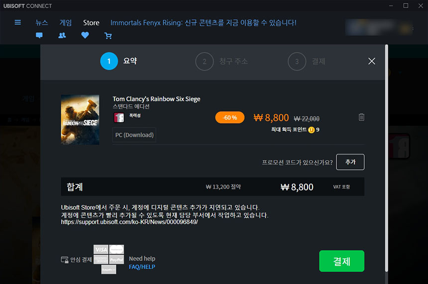 레인보우 식스 시즈의 평소 판매 가격은 22,000원이고 할인 가격은 8,800원입니다. 그리고 요약 메뉴의 아래쪽에 있는 결제 버튼을 누르면 본격적인 결제 과정이 진행됩니다.