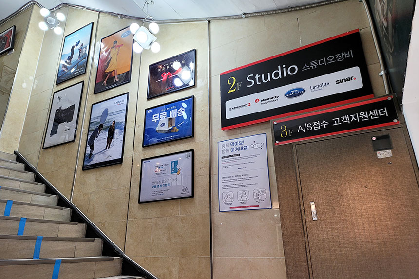 그리고 세기 p&c는 각종 테스트를 진행할 수 있는 자체 스튜디오는 물론이고 삼각대와 헤드 그리고 가방 등 사진이나 영상 촬영에 관련된 다양한 제품들을 전시해 놓고 있어서 수리하는 도중에 구경해도 좋을 것 같습니다.