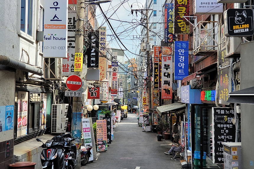 오랜만에 충무로를 가보니 어지럽게 걸려있는 전기와 케이블 라인이 상당히 인상적이었습니다. 날씨가 좋을 때 망원 렌즈로 배경을 조금 더 압축해서 촬영하면 재미있을 것 같다고 생각했습니다.